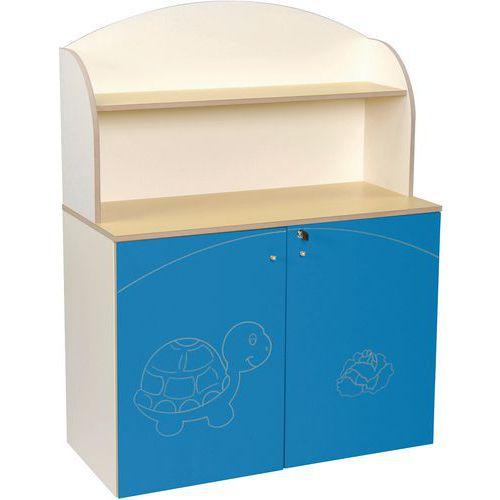Structure coloris blanc, portes battantes de couleur avec gravures décor tortue et salade. Bouton, serrure et clés fournis. Vérins de réglage. Livré monté.